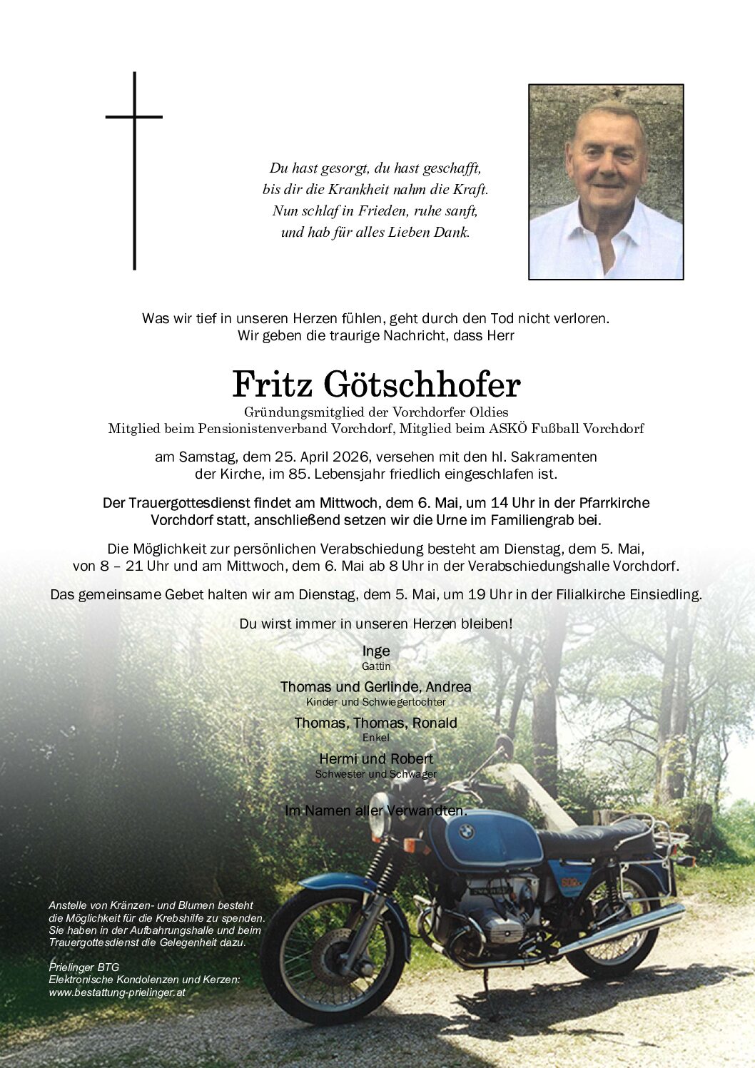 am Dienstag, dem 5.5 von 8 – 21 Uhr und am Mittwoch, dem 6.5 ab 8 Uhr – Aufbahrungshalle Vorchdorf.